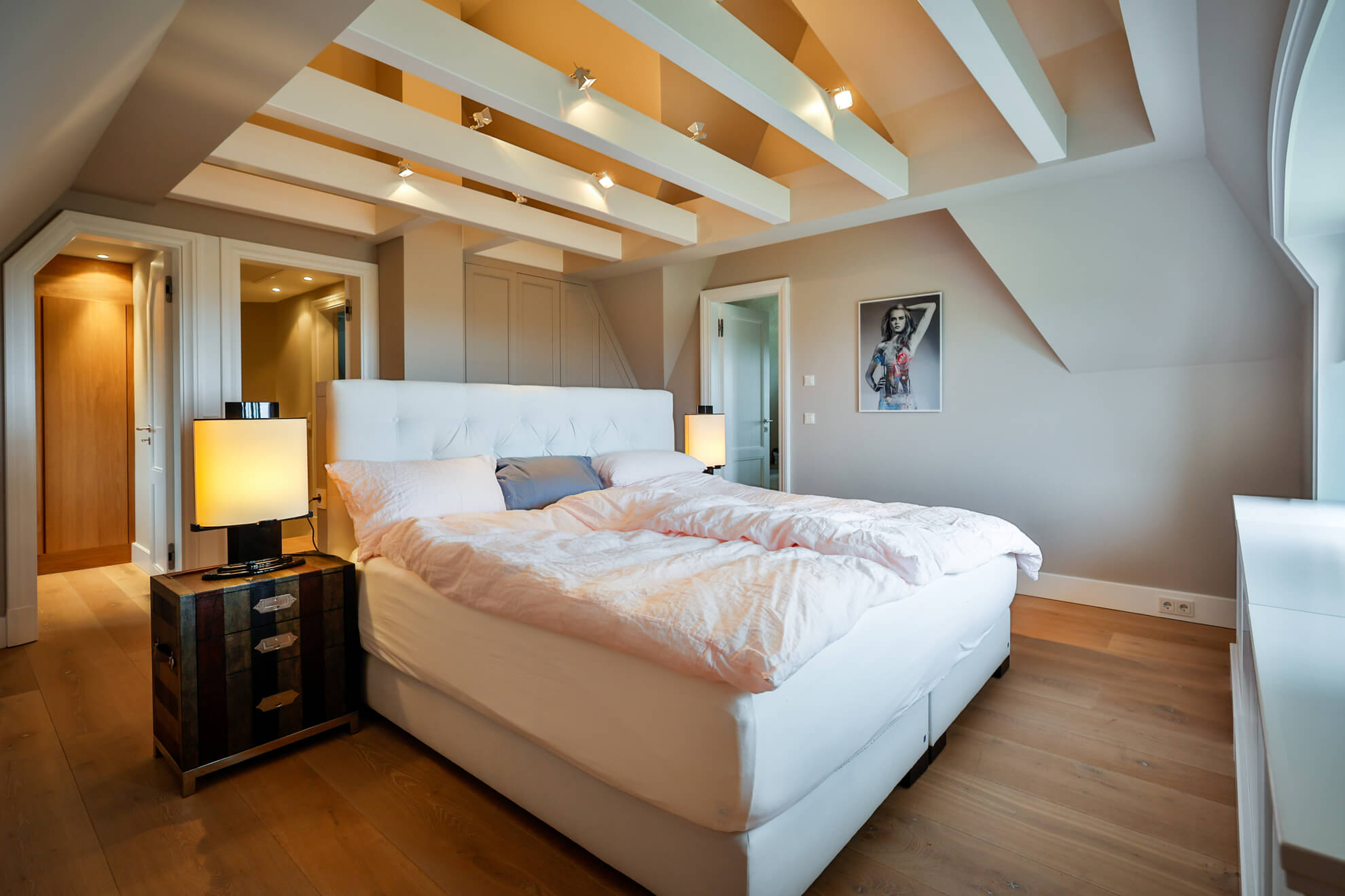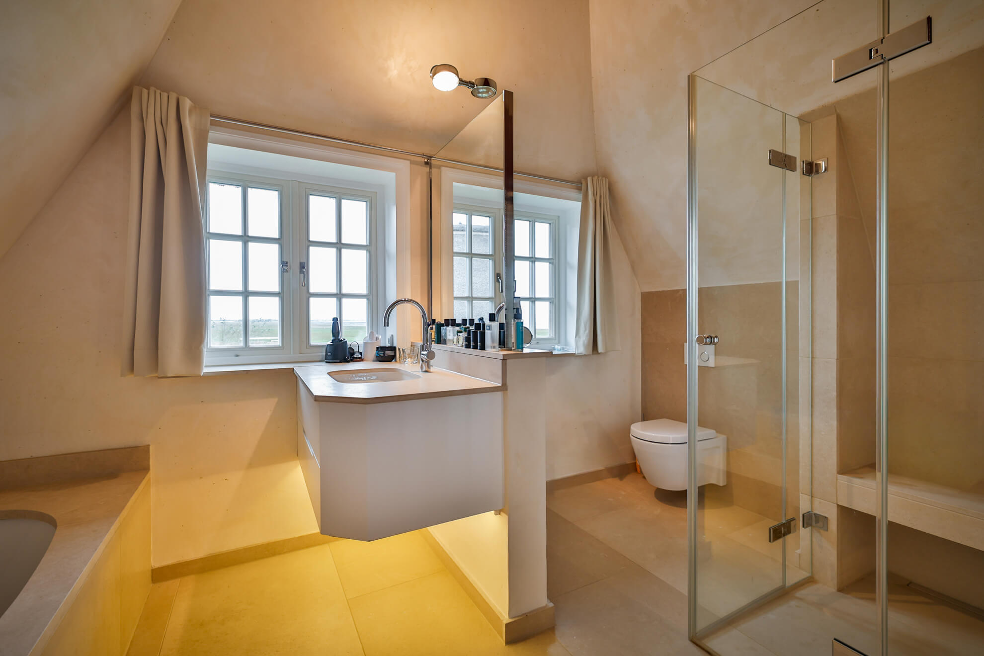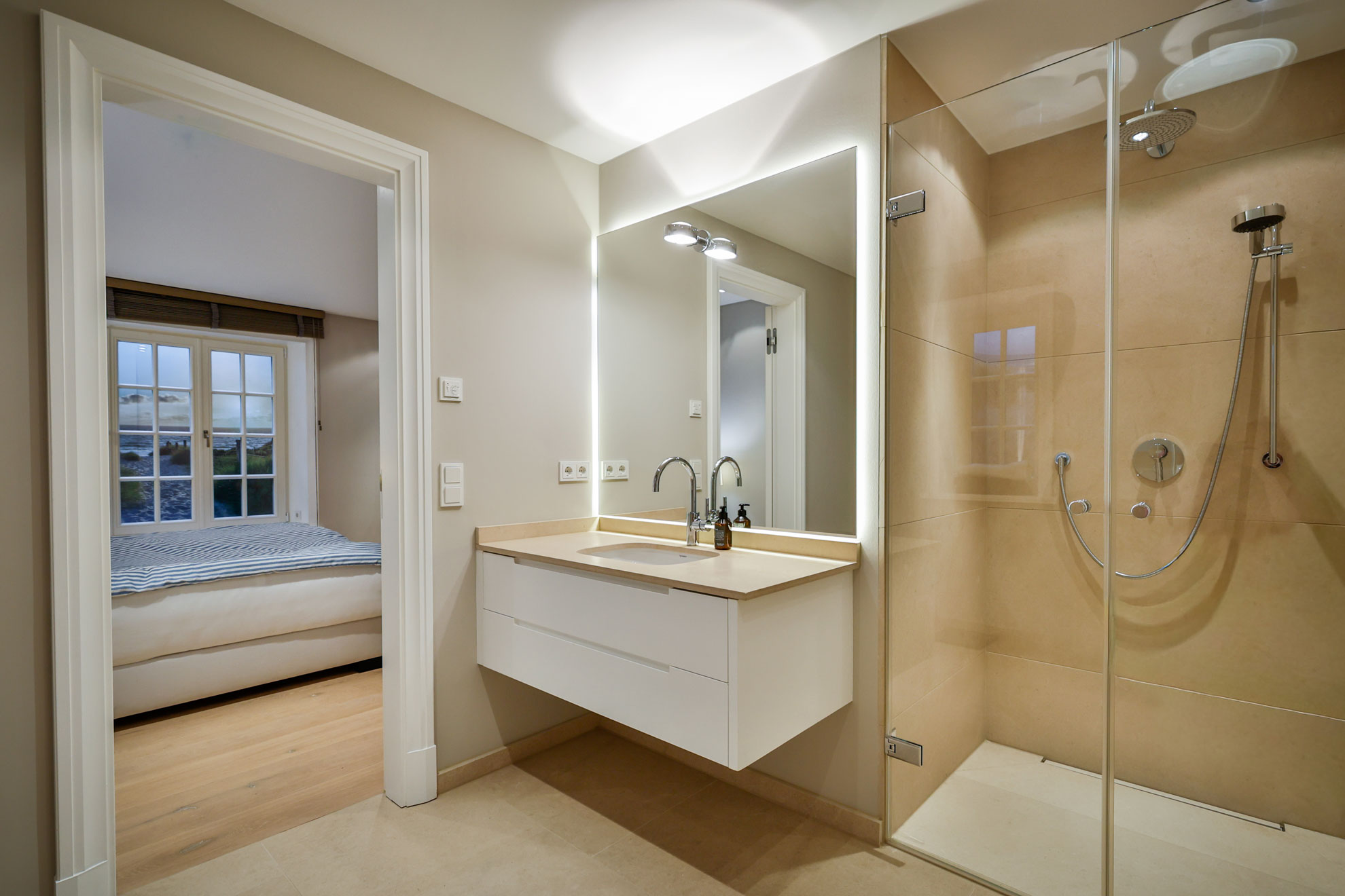 Das Erdgeschoss empfängt Sie mit einem großzügigen Eingangsbereich mit Gaderobe und einem Gäste-WC. Der lichtdurchflutete Wohn- und Essbereich mit Kamin, ist zum Watt ausgerichtet und verfügt über einen Zutritt auf die Terrasse. Die Küche ist geräumig und lässt sich durch eine Schiebetür separieren. Das OG bietet zwei Schlafzimmer, eines davon ist ebenfalls zum Wattenmeer ausgerichtet und überzeugt außerdem durch die geräumige Ankleide sowie das große Badezimmer mit Dusche, Badewanne und einem Waschtisch. Das zweite Schlafzimmer verfügt ebenfalls über ein Bad en Suite. Das UG bietet eine Sauna mit Wärmebett, zwei weitere Räume mit jeweils einem Bad, einen Technikraum sowie den Hauswirtschaftsraum.