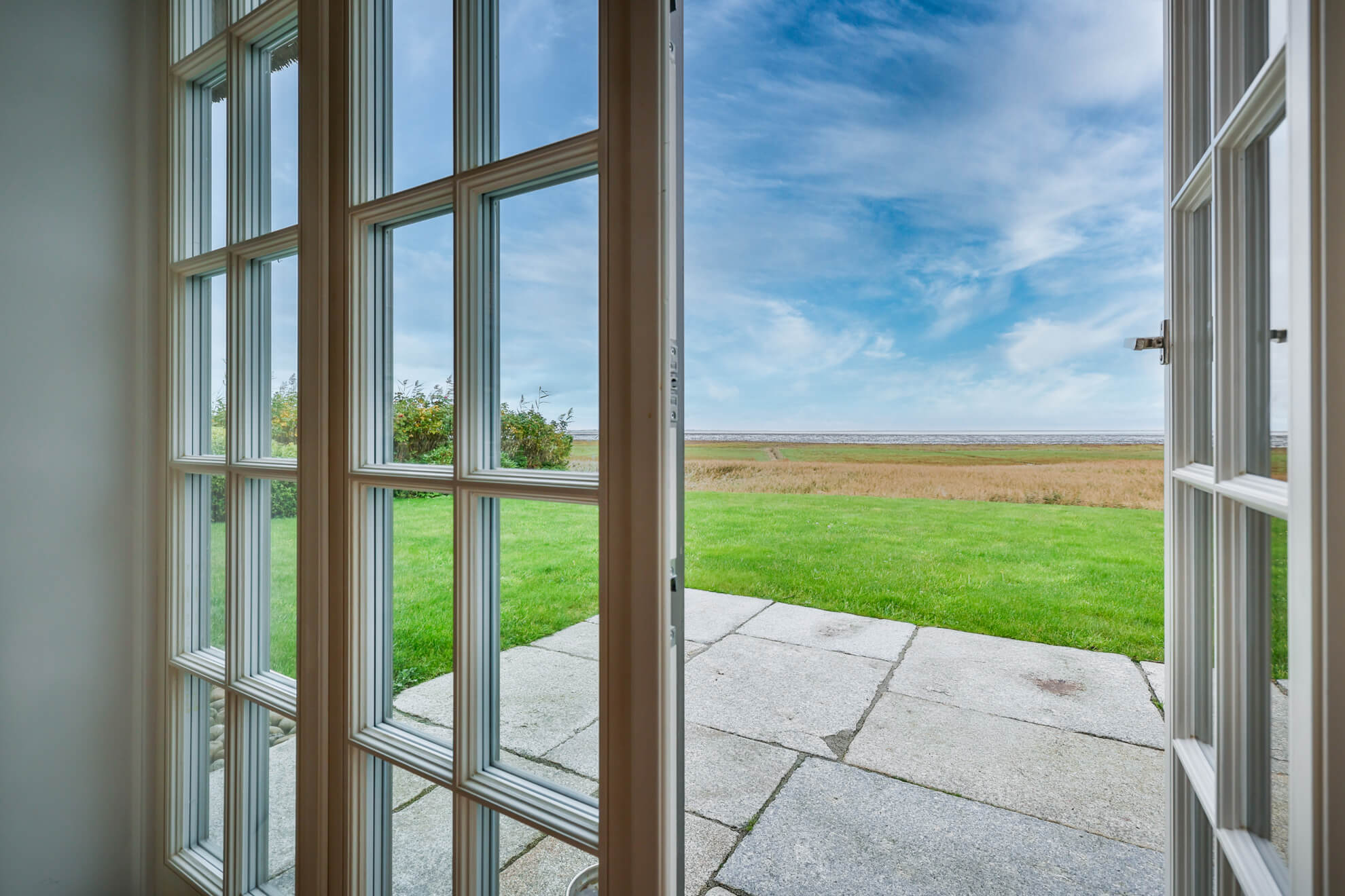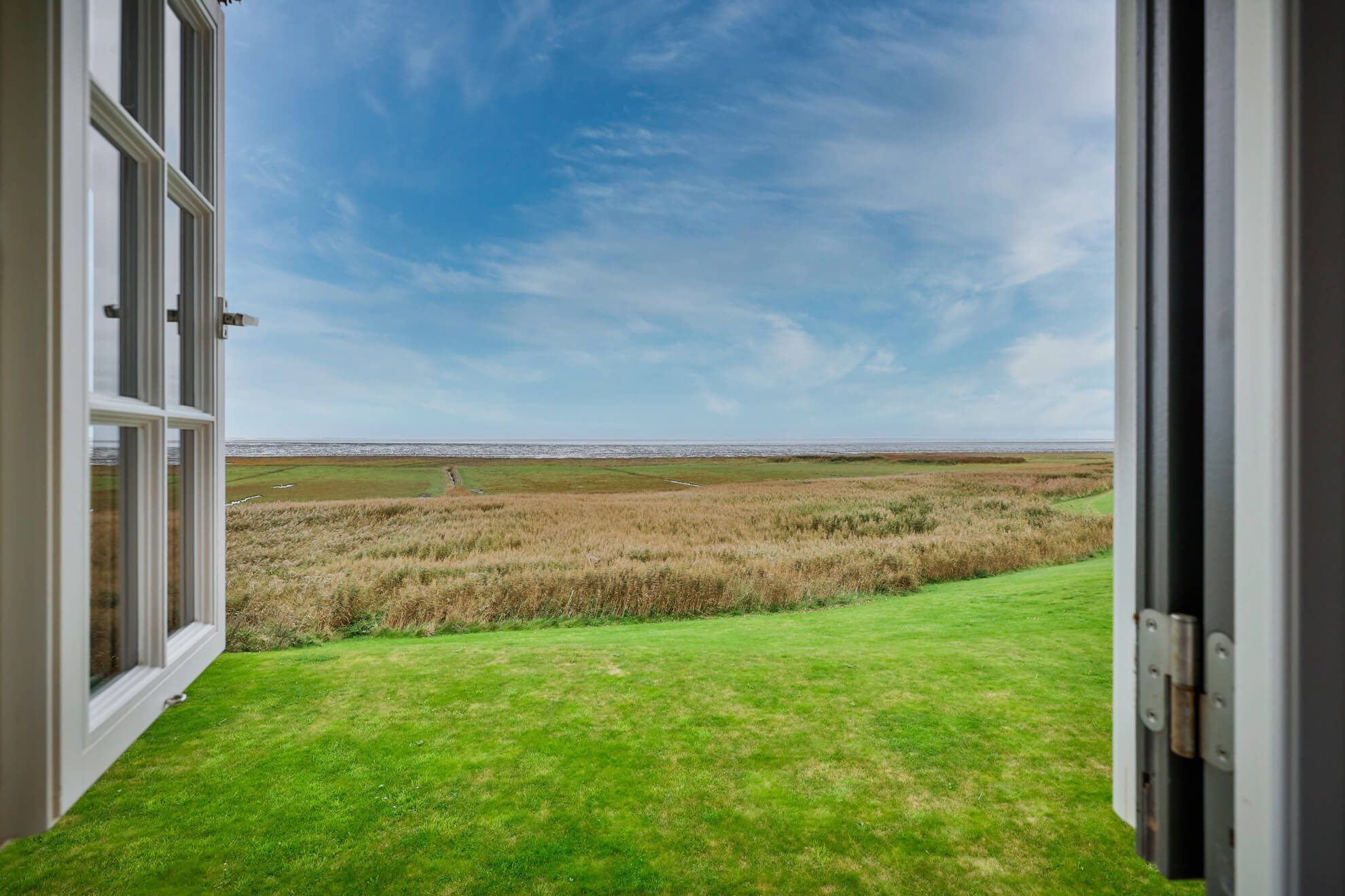 Traumhafte und ruhige Lage direkt am Wattenmeer mit Blick über Wiesen und Heideflächen.