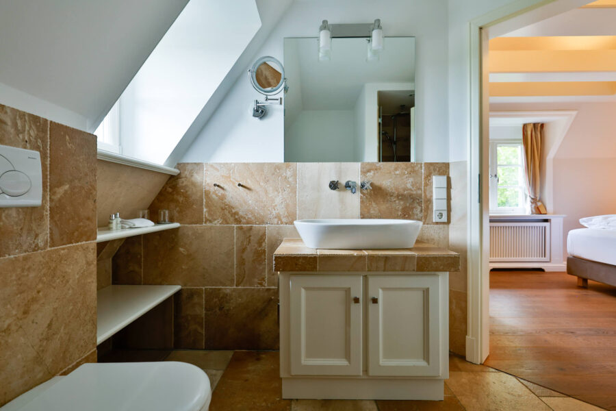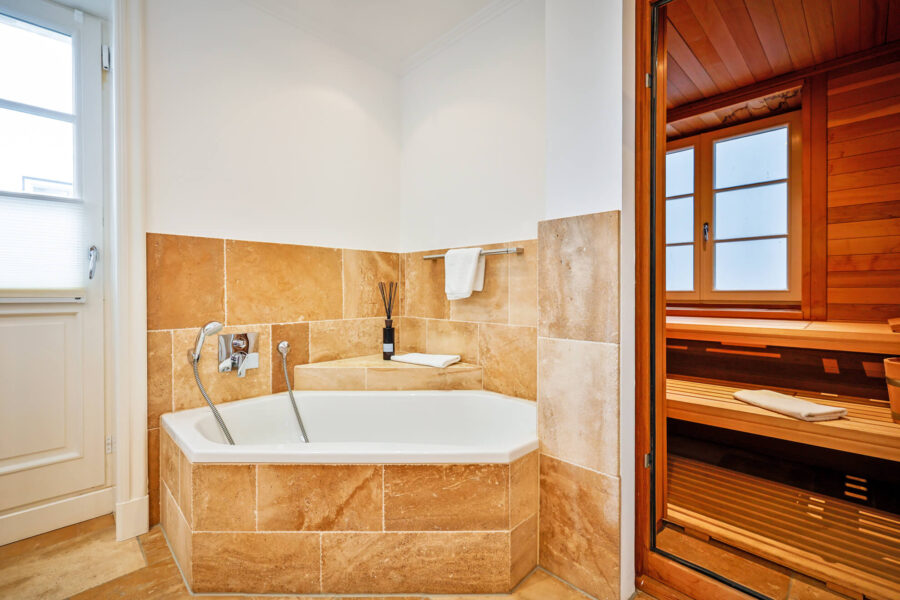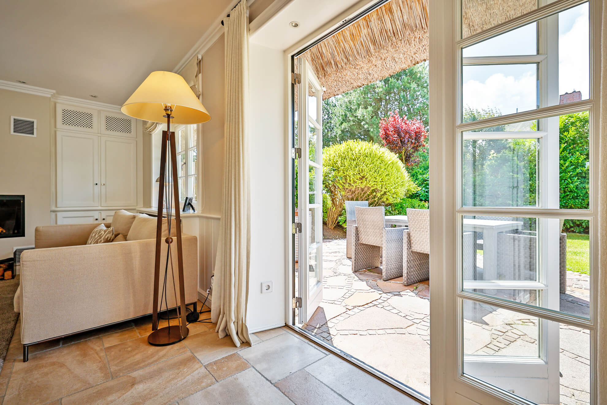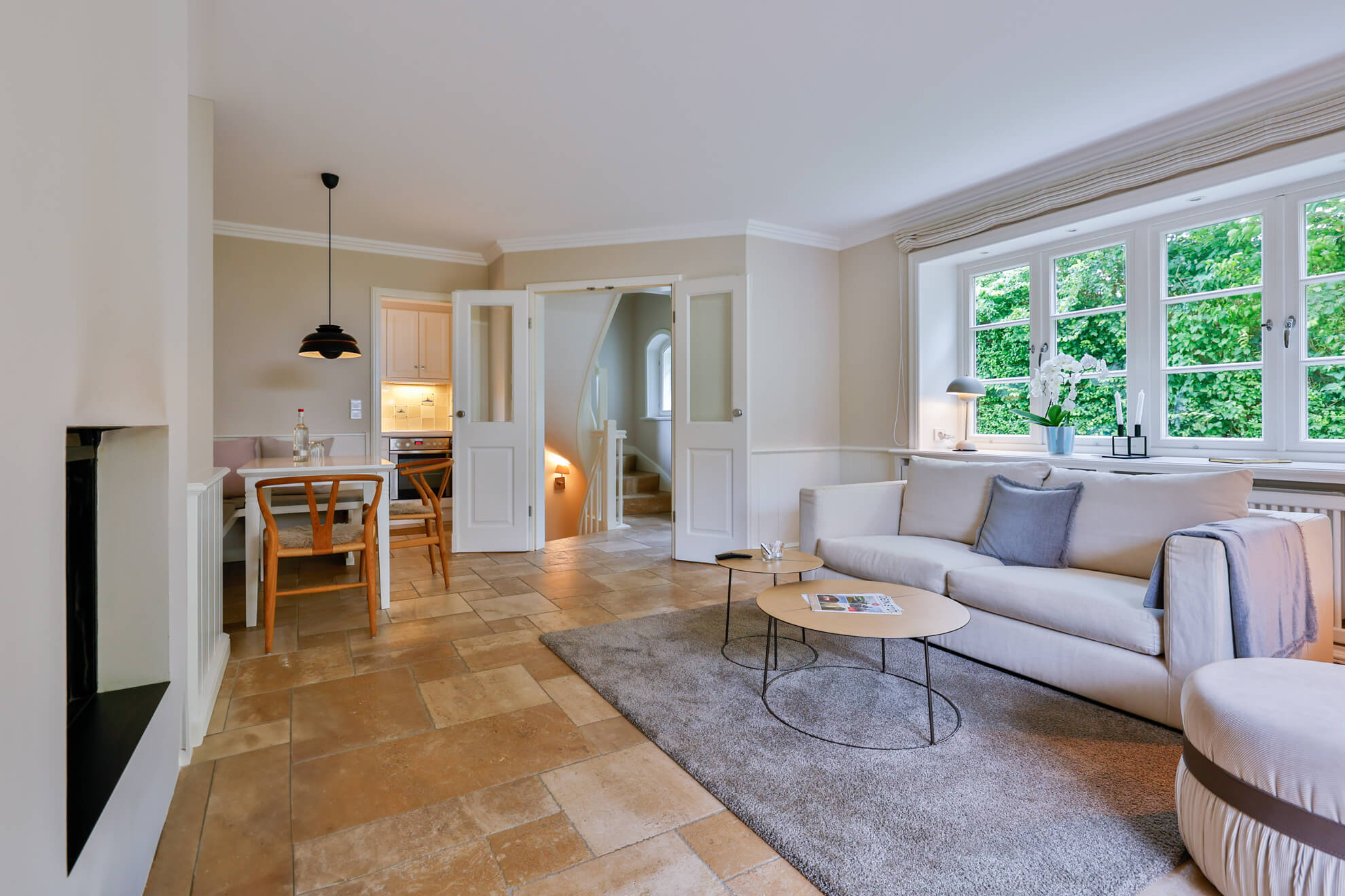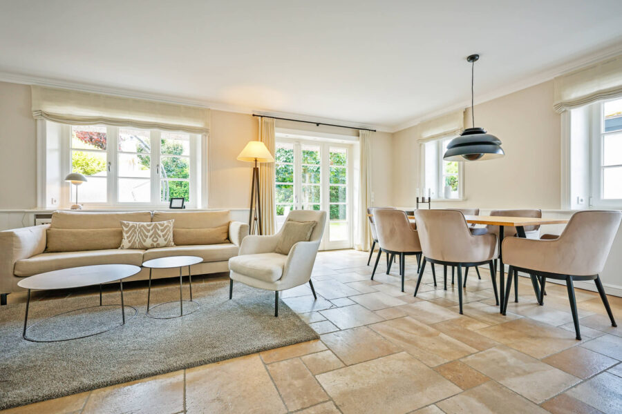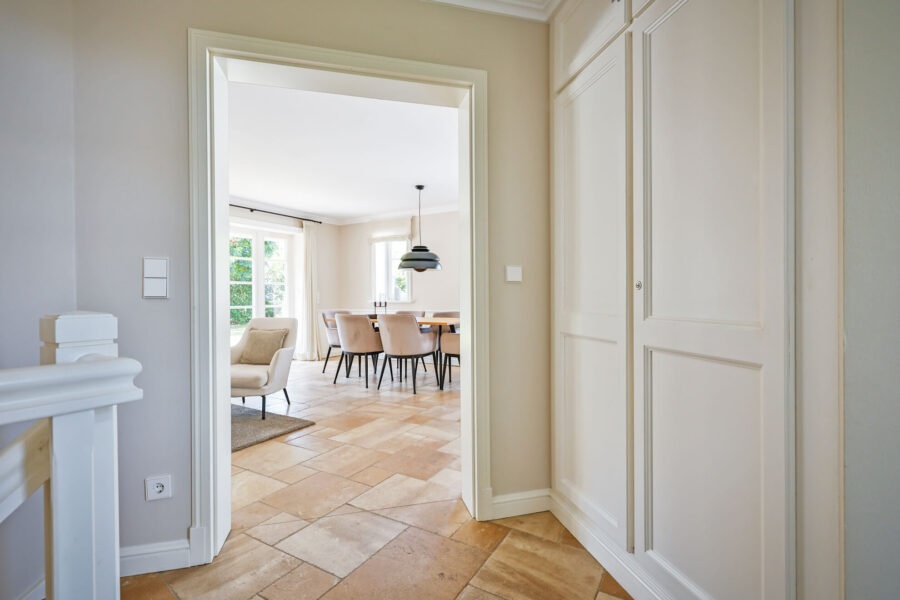 Typische Stilelemente wie Natursteinböden, edle Holzdielen und maßgefertigte Tischlereinbauten verleihen dem Haus eine warme, authentische Atmosphäre und unterstreichen den nordischen Charakter. Große Sprossenfenster sorgen für lichtdurchflutete Räume und schaffen ein behagliches Wohngefühl.