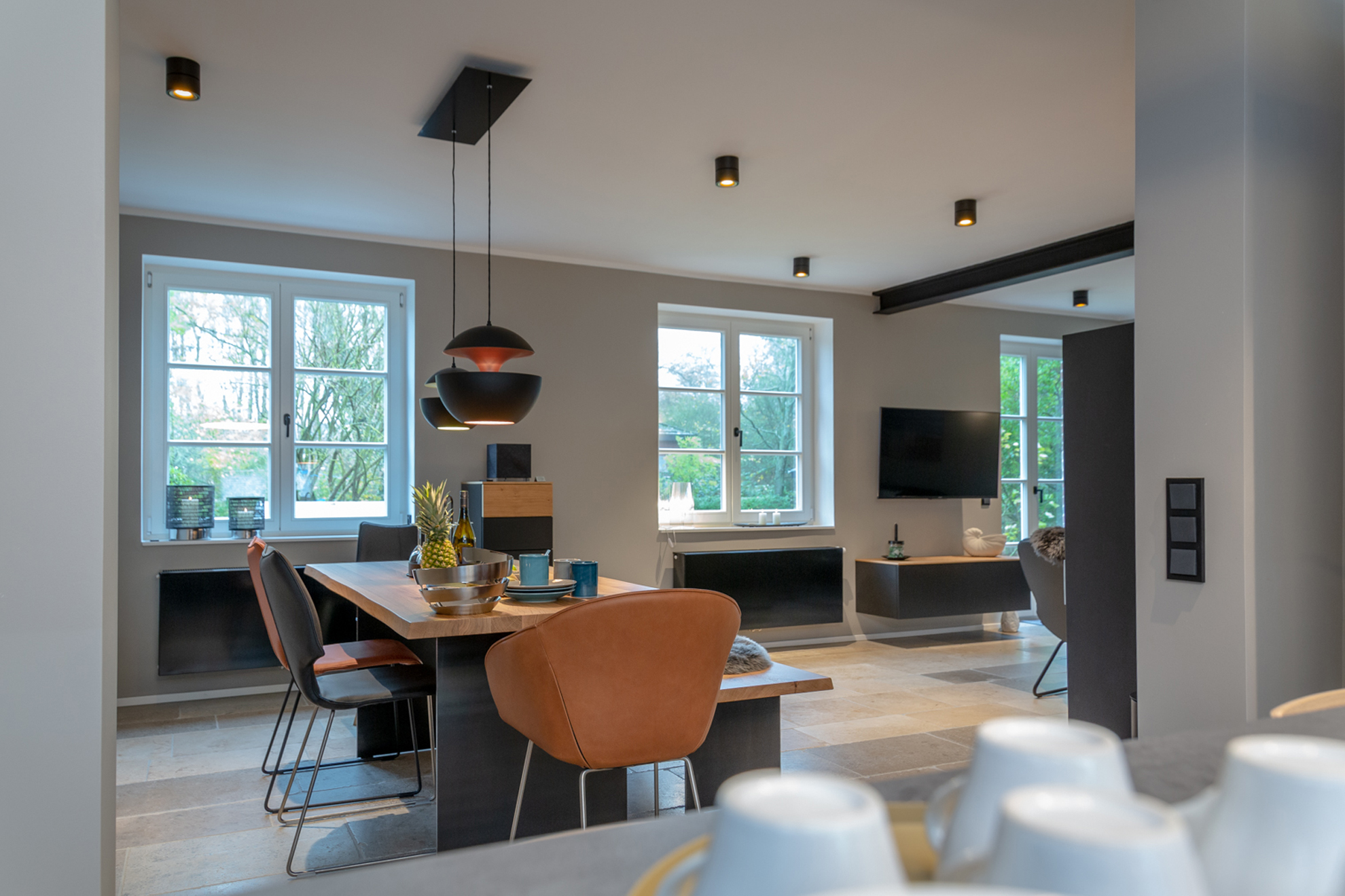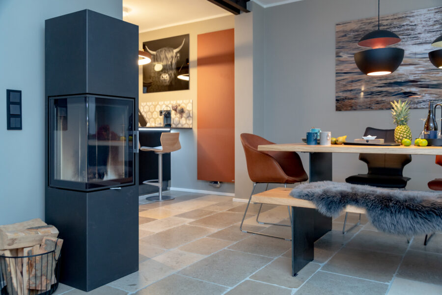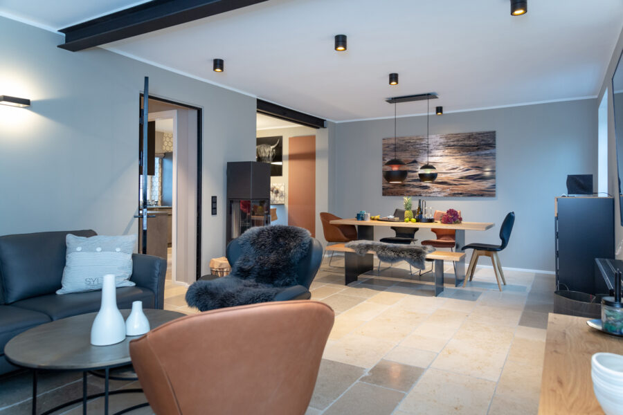 Die Immobilie überzeugt durch eine moderne Raumaufteilung und einen hohen Ausbaustandard. Hochwertige Materialien wie Eichendielen und Natursteinfliesen, individuell gefertigte Tischlereinbauten, ein stimmungsvolles Lichtkonzept sowie ein offener Kamin schaffen eine sofort spürbare Wohlfühlatmosphäre.